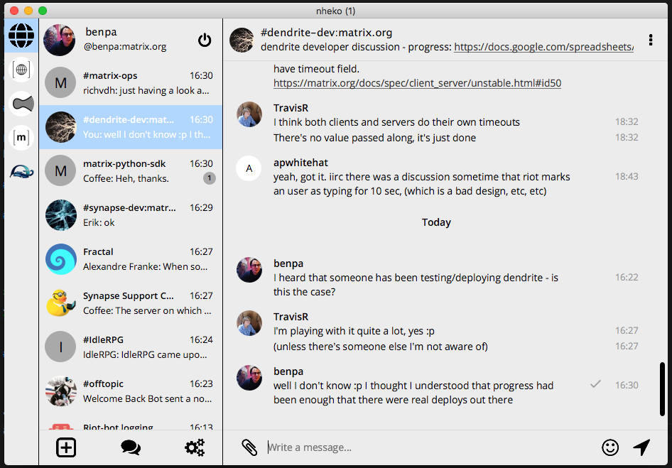 Half-Shot has been working tirelessly on the IRC bridge lately, so I wanted to update on his recent successes: