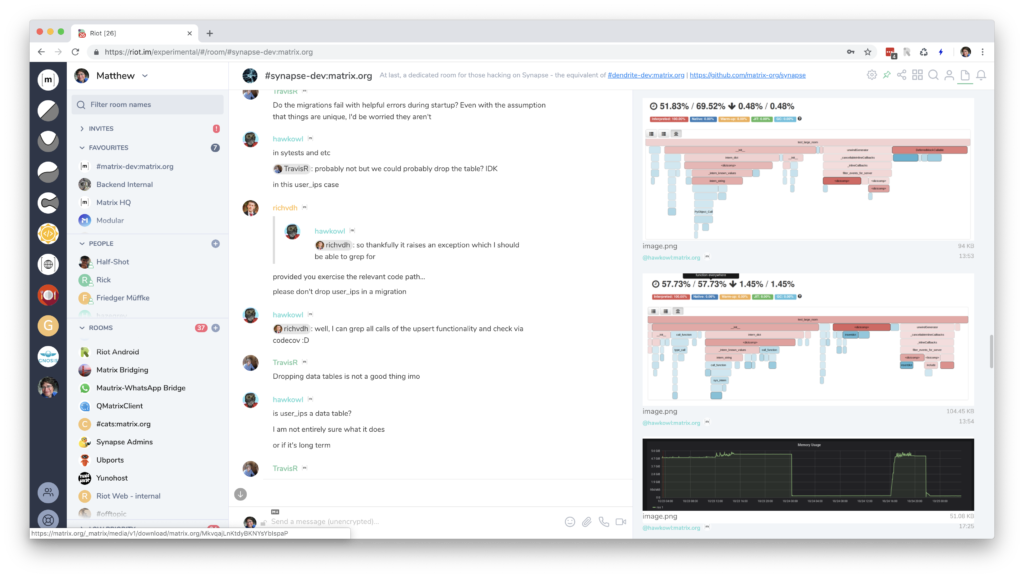 Lots of stuff then happened over the following months - we secured funding in Jan 2018; the French Government began talking about switching to Matrix around the same time; the pressure of getting Matrix (and Synapse and Riot) out of beta and to a stable 1.0 grew ever stronger; the challenge of handling the ever-increasing traffic on the Matrix.org server soaked up more and more time, and we started to see our first major security incidents (a major DDoS in March 2018, mitigated by shielding behind Cloudflare, and various attacks on the more beta bits of Matrix itself).