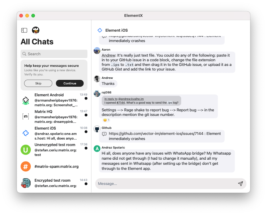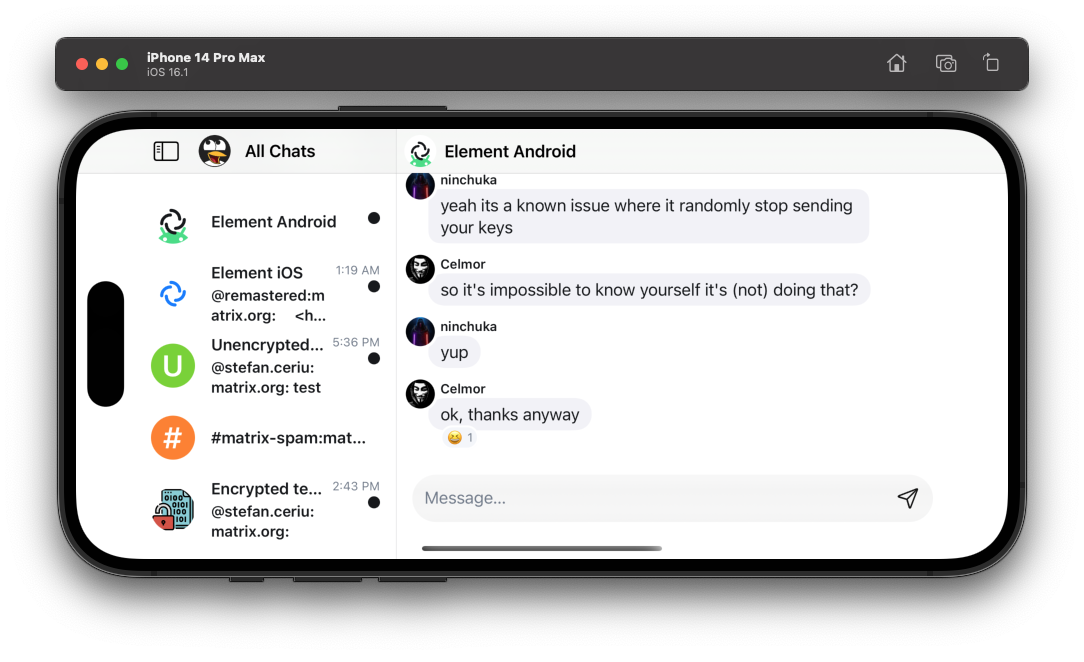 • We are making progress on ElementX, which is a new client using the Matrix Rust SDK and Jetpack Compose. This app is now able to display a timeline and send messages to a room using the wysiwyg composer.