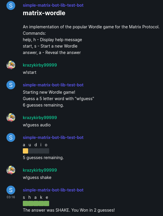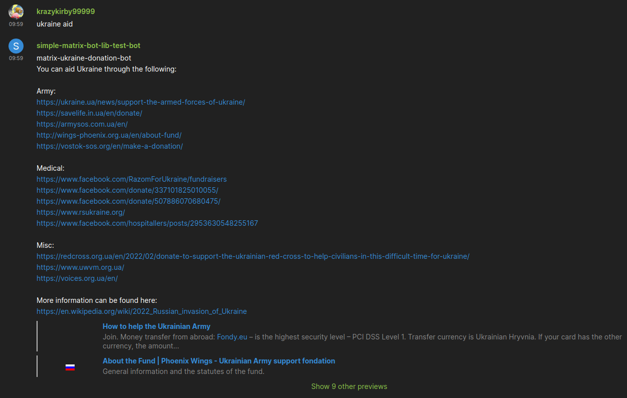 command for the developers in the ReactOS Matrix Rooms, which translates error codes to human readable text. Then of course i added other useful or fun commands to the bot. You want to read the Readme to find out more. This is the first time i ever wrote a bot, so feedback and corrections to the Source Code are highly appreciated. It is written in Go using the mautrix-go framework (thanks tulir and everyone who worked on this making it easy!). Even easier is to run and build it with go, no insane build system with broken dependencies required, which was the reason why i made it from scratch.