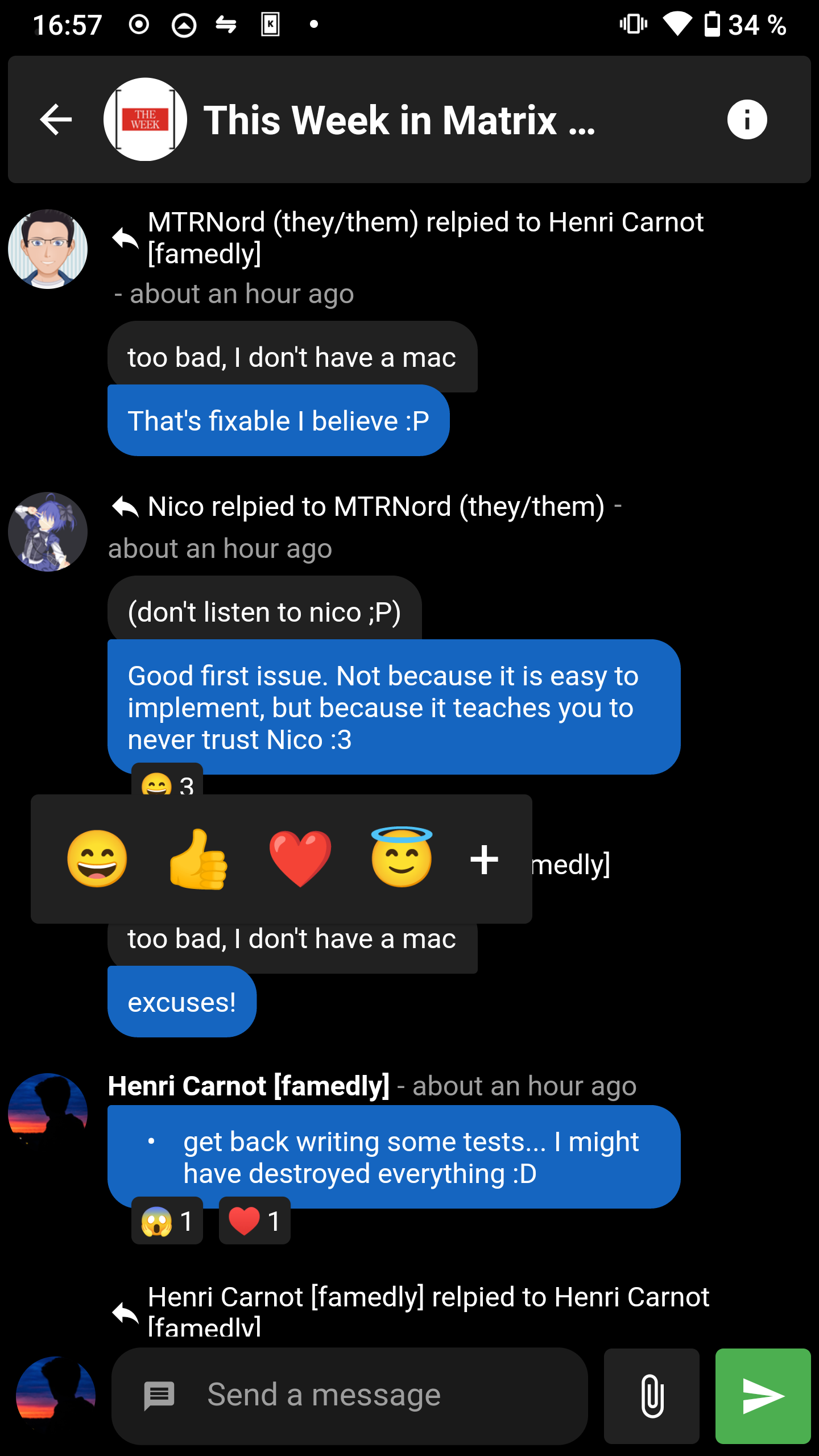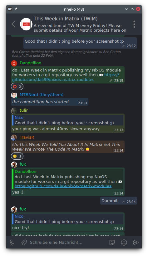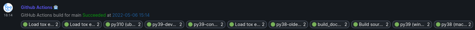 I have spent the day ignoring more important things and trying to have something to TWIM. I wrote (yet another) GitHub Action for sending build status to matrix rooms. This action looks at all the completed jobs in your workflow and posts a combined status for the workflow as a message and reactions for all the individual jobs, inspired by the maubot GitLab plugin.