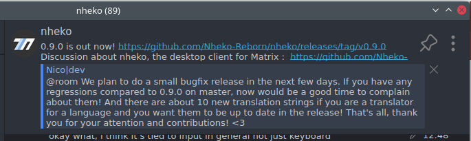 NeoChat 22.02 is out with the possibility of sharing files directly from NeoChat to other apps and services (Nextcloud, Imgur, email, ...). We also added support for minimizing the application to the system tray on startup and you can now label accounts to better organize them if you are using the multi-account feature. Aside from that, we spend some time fixing many small bugs and paper cuts reducing the total amount of open bug reports by 20%.