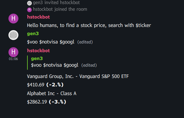 If you missed it last week, I published a template / demo stock reporting bot you can find here: https://github.com/WesR/Halcyon-stock-bot . Short and sweet, this little bot should be a great starting point if your looking into making a bot. Make sure to also checkout the library itself for more examples, and usage information https://github.com/WesR/Halcyon.