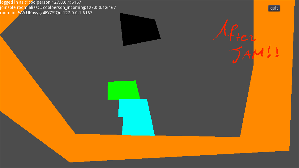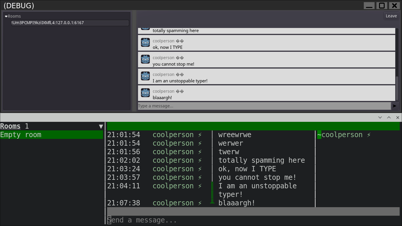 @s7evink The game is called AAGRINDER, hosted at aagrinder.xyz, the code is here, the bridge implementation is here, wiki is here. The game is a text-based sandbox multiplayer browser game that I (Maze) have been building for the past 3 years. Built from nothing, no game engine. It generates an infinite procedural terrain to venture in. The integrated chatbox is nothing special but it's really nice to have it bridged to Matrix now, it's less lonely when playing alone. The appservice bridge creates users matching player name and color. Display names from Matrix are presented in the same color as in Element.