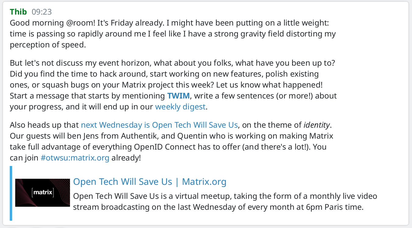 See you next week, and be sure to stop by #twim:matrix.org with your updates!