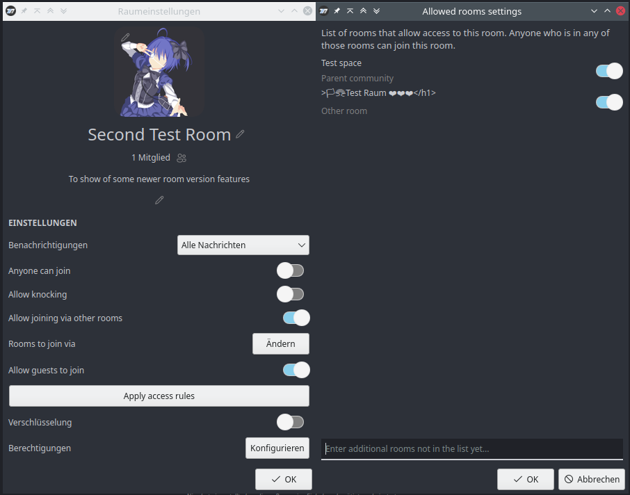 We completely redesigned how you can modify the access rules in a room. You now have a list of toggles to allow public access to a room, knocking and/or joining via a different room. You can also now edit what rooms you can access the current room via. By default the parent communities are in that list and you can enable joining via those using a toggle button, but you can also add other rooms in. This is helpful when you have a welcome room in a private community, but you still want people to be able to join the other community rooms after you explained the rules in the main room. We are still working on restructuring the room settings though, so that the new rules UI doesn't seem as out of place between the other settings.