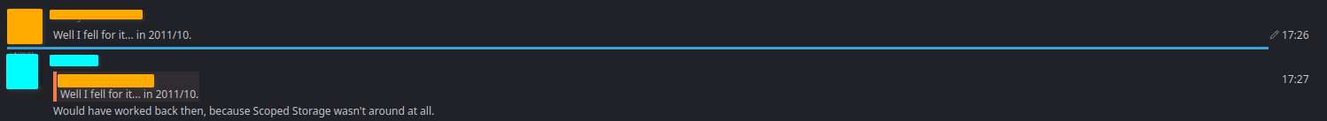q234rty also fixed sending messages using the Enter key, when an input method is active. We significantly shrunk our flatpak images (to almost a third) by using the upstream gstreamer again (which is recent enough in the recent runtimes now). Thanks to Forest users now have significantly more control over what Nheko logs when troubleshooting an issue and Hiers added an unread line to make it easier to find where you left off. (The blue line is the unread indicator, the names and avatars are just replaced with color boxes to protect the innocent.)