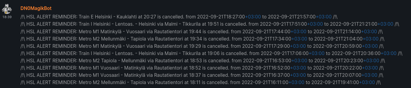 A very simple bot to notify rooms every 12h of HSL (Helsinki Regional Transports) disruptions (for instance, cancelled trains, metros, buses or trams).