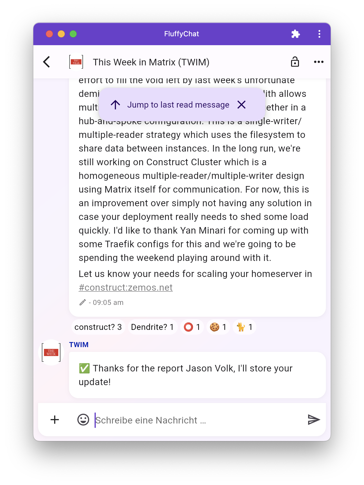 . This is done, because the spec handwaves away concerns, that rooms might have non-default powerlevels, but I am in a lot of those and it would be annoying to me.I guess this was a bit of a more technical update this time, but maybe it had some interesting bits. I spent a lot of time the last weeks fixing stuff in Qt, profiling memory usage as well as code size and others are working on cool stuff as well, so stay tuned for next week. :3