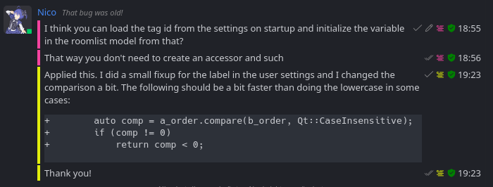Similarly I reworked how our message variant/enum type works. This made the debug build of Nheko shrink from 450MB to 350MB for me, which is quite significant, even if it probably has no visible impact on any users, since the compressed debug size as well as the stripped binary are basically the same size. (The flatpaks were at 5MB download size and still are at 5MB download size.) It does make some of our error messages nicer and allows us to implement some further improvements for devs down the line. It does mean Nheko now won't compile on GCC10 anymore though, which is included in the current debian stable release. But the next Debian release is just around the corner, so hopefully the impact from that is limited.