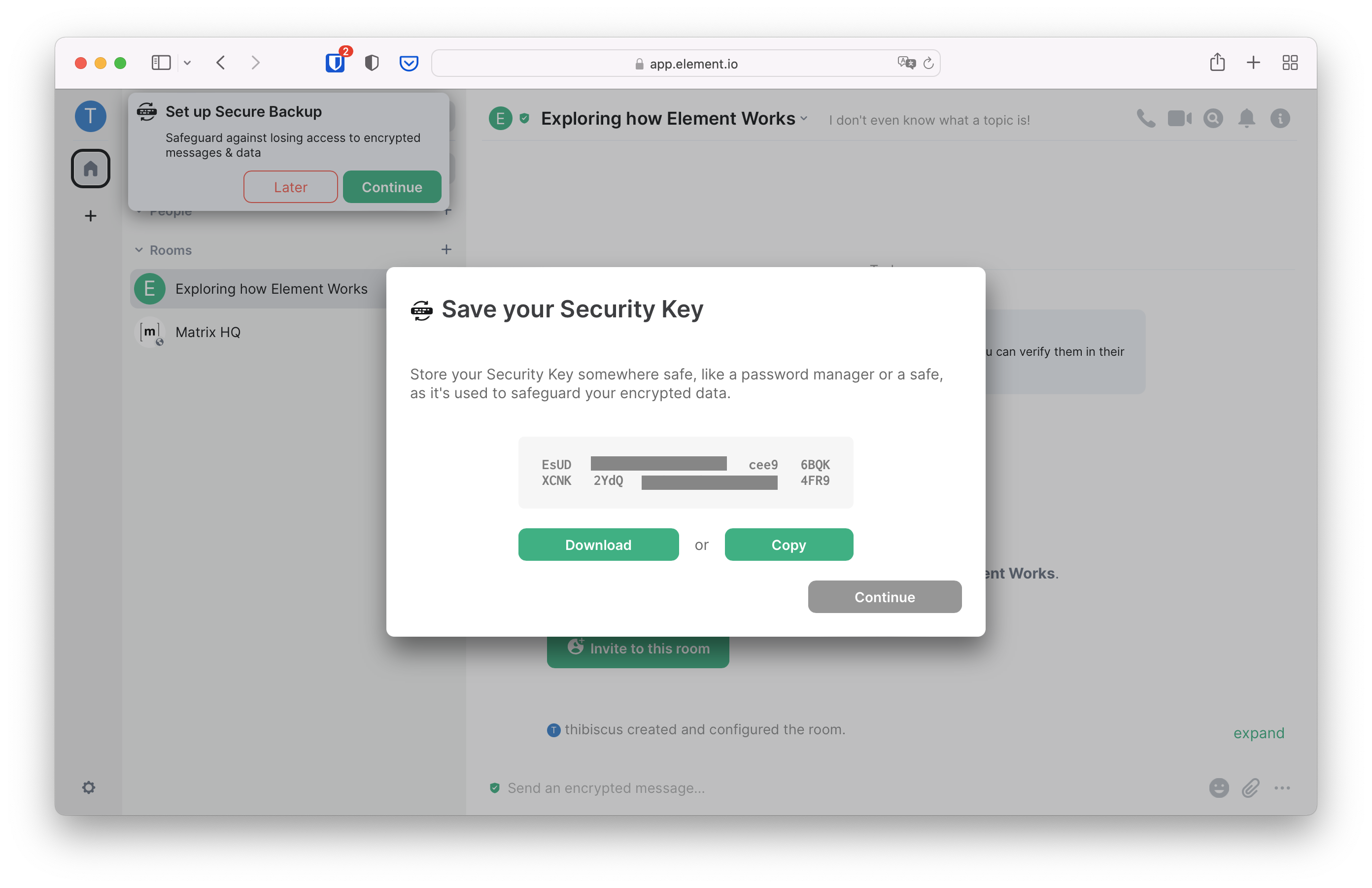 Element will display the Security Key it has generated. This is a unique and very secret key that should only be known by you. In your day to day usage of Matrix, you will not need it. But if all your devices connected to Matrix stop functioning, are stolen, or if you just lose access to them: this Security Key is the only way for you to regain access to your messages. You should store it in a password manager if you use one, or at least print it and save it somewhere safe. As inconvenient as it sounds, this is necessary to ensure nobody else but you can read encrypted messages.