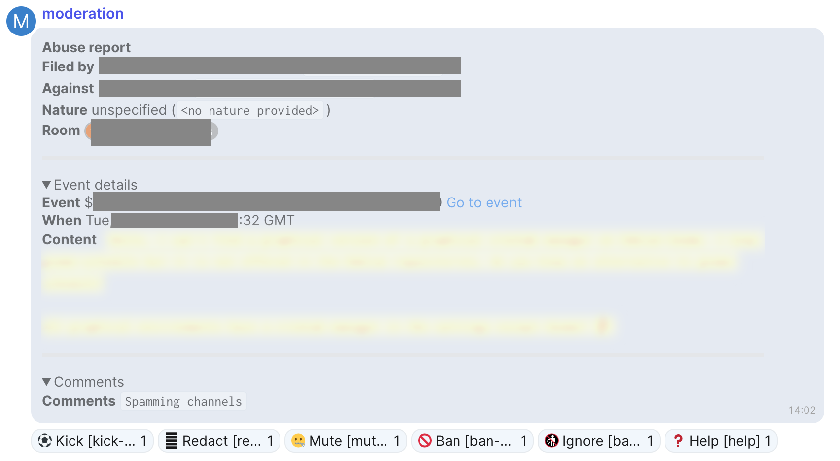 button below it, mjolnir will kick the user from the room where they were reported.If you don't have moderation reports enabled, you can also kick a user either from a specific room or globally with the following command.